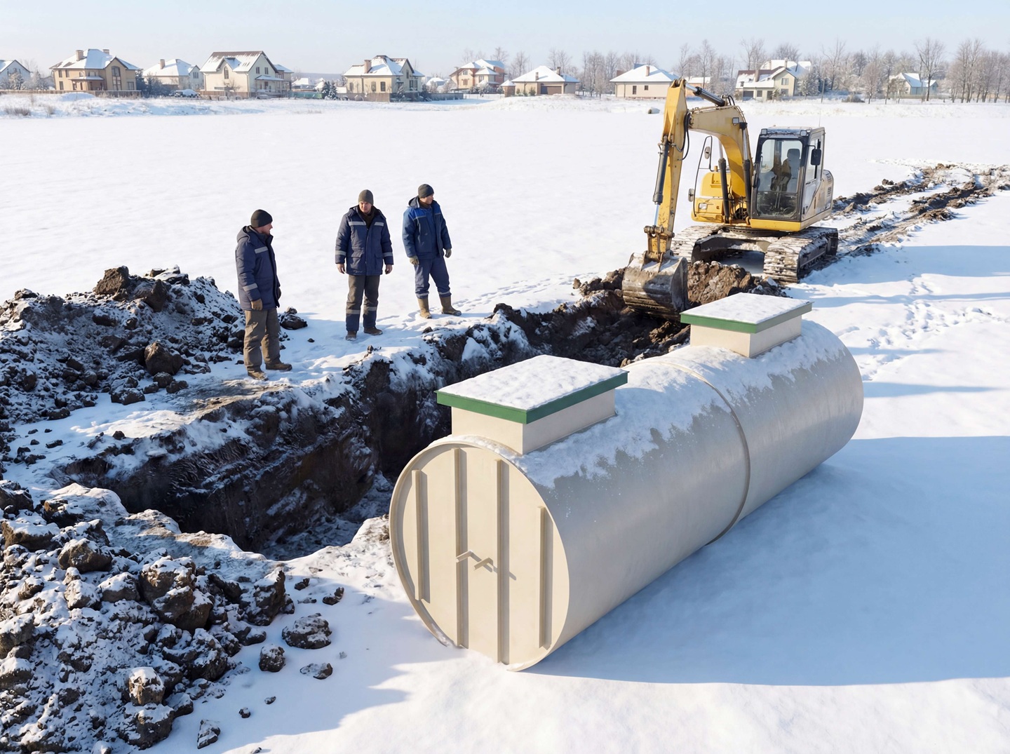 Корпус станции выполнен из первичного полипропилена — прочного и пластичного материала с длительным сроком службы, устойчивого к коррозии и агрессивным средам. Конструкция рассчитана на эксплуатацию в тяжёлых и пучинистых грунтах и не требует дополнительного якорения. Подземное размещение технологической ёмкости позволяет сохранить полезную площадь участка.